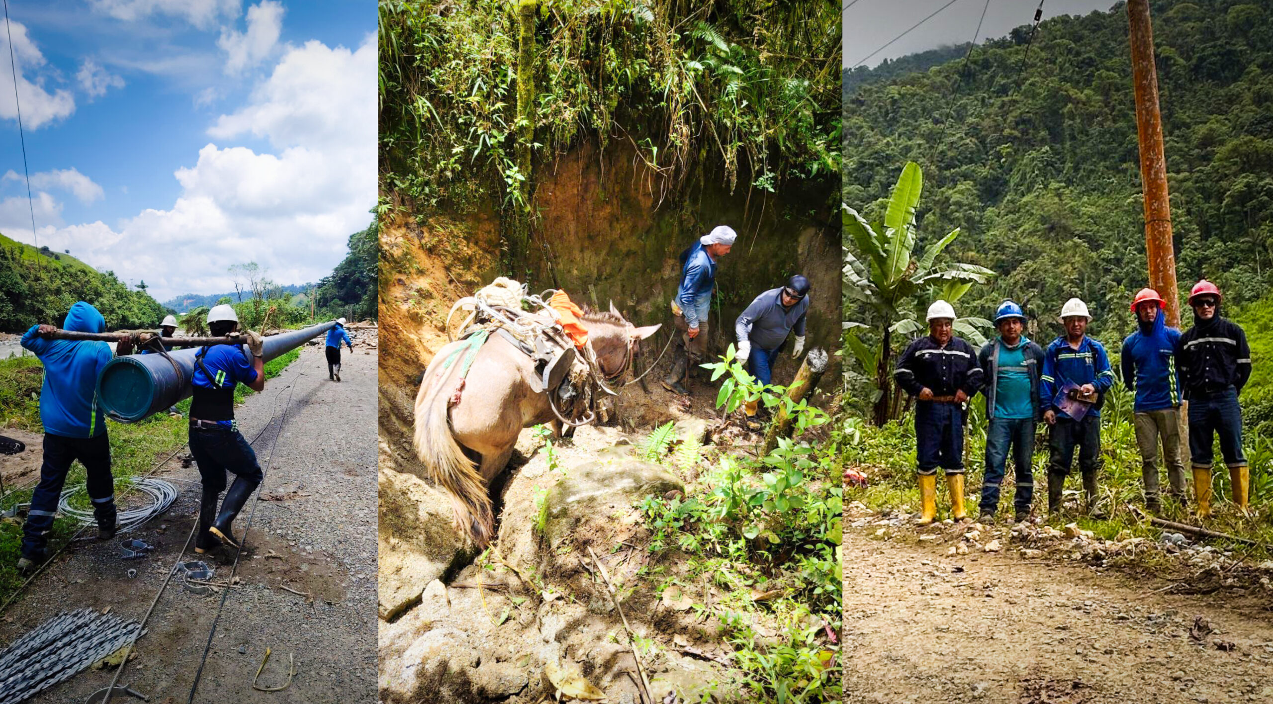 Desde el traslado de materiales por trayectos montañosos a pie hasta la carga de postes a través del lecho de un río, cuya creciente afectó las vías de comunicación, han sido las acciones implementadas por un equipo humano con alta vocación de servicio ante la grave situación.
