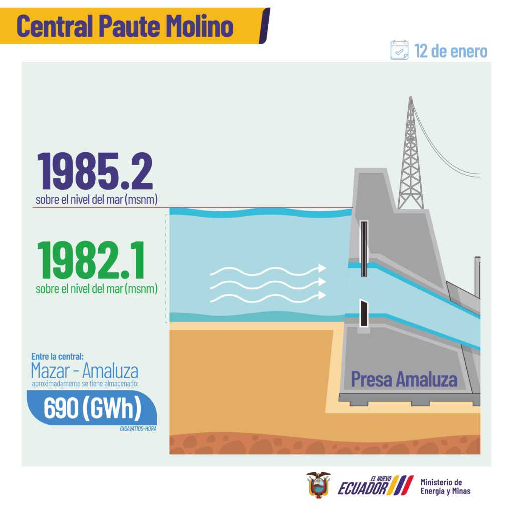Según datos del Operador Nacional de Electricidad (Cenace), en cuanto al Complejo Integral de Paute, los embalses de las centrales Mazar y Amaluza se encuentran en cotas cercanas a 2 143.2 metros sobre el nivel del mar (msnm) y 1 982.1 msnm respectivamente, lo que representa una energía almacenada de 690 gigavatios-hora (GWh) aproximadamente.