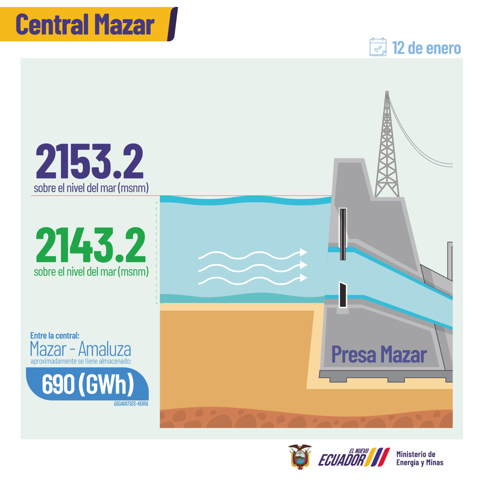 Según datos del Operador Nacional de Electricidad (Cenace), en cuanto al Complejo Integral de Paute, los embalses de las centrales Mazar y Amaluza se encuentran en cotas cercanas a 2 143.2 metros sobre el nivel del mar (msnm) y 1 982.1 msnm respectivamente, lo que representa una energía almacenada de 690 gigavatios-hora (GWh) aproximadamente.