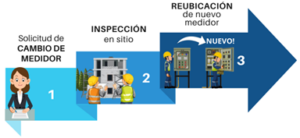 Este trámite permite realizar el cambio de ubicación del medidor dentro del mismo predio o propiedad. Es para situaciones en las que se requiere mover el medidor a una posición más conveniente, como la fachada o una zona de fácil acceso, ya sea por motivos de remodelación, mantenimiento, o para facilitar la lectura y revisión del equipo.